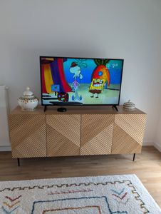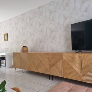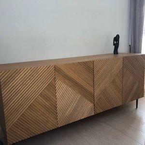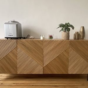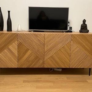 Buffet design en bois foncé chêne massif gravé et métal noir 4 portes L180 cm ARCHIPEL