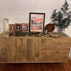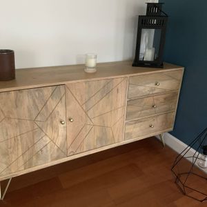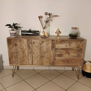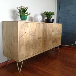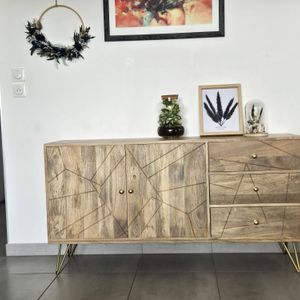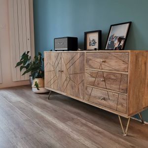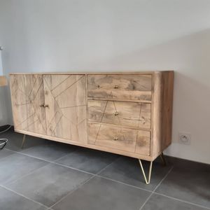 Buffet gravé en bois manguier massif et métal doré 2 portes 3 tiroirs L145 cm LINIUM