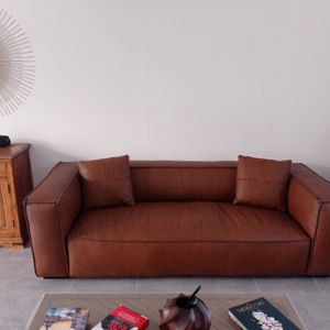 Canapé vintage 3 places cuir marron et bois noir COBAIN