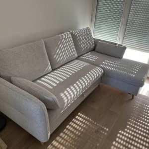 Le rembourrage de ce canapé d'angle réversible est composé de deux couches de mousse, une couche de mousse haute résilience pour la tenue et une couche de ouate pour le confort. Une fois l'assise tirée, ce convertible offre une belle surface de couchage (L140 x L205 cm) pouvant accueillir 2 personnes. La méridienne renferme un coffre de rangement, pratique pour le linge de lit.
