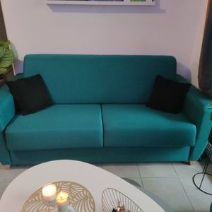 Grâce à son design soigné, ce canapé-lit est idéal pour s'aménager un coin nuit optimal sans faire une croix sur sa déco. Son assise renferme un sommier équipé d'un matelas 140 x 190 cm afin de pouvoir dormir à deux confortablement. Combinaison parfaite entre un canapé design et un véritable lit, le canapé convertible GRAHAM conviendra parfaitement pour faire dormir ses convives. Ses deux espaces de rangement dissimulés dans le dossier en font l'allié des petits appartements.