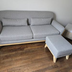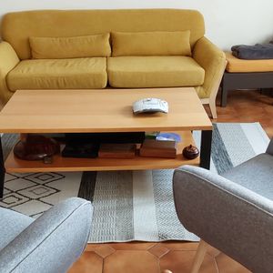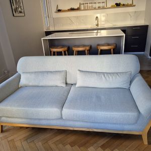 Canapé 3 places en tissu beige et bois clair YOKO livré prêt à assembler. Montage simple, seul le dossier est à fixer. Le colis étant volumineux, nous vous conseillons de vérifier que portes et escaliers permettent son passage.