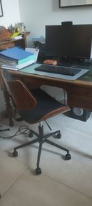 Bien pensée, cette chaise de bureau à roulettes beige et bois clair avec siège pivotant 360°, se déplace aisément d'une pièce à l'autre et garantit une mobilité appréciable à ses utilisateurs.