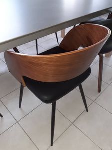 Ce modèle de chaises de salle à manger est la synthèse parfaite entre confort et modernité. L'assise souple et ferme (densité de la mousse 24 kg/m3) est habillée d'un élégant revêtement noir (100% polyuréthane) au grain lisse et régulier. Ce revêtement est à la fois doux au toucher, résistant à l'usure et facile d'entretien.