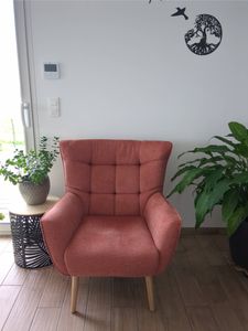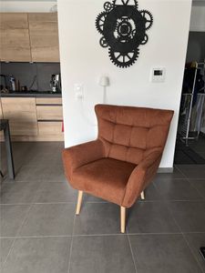 Fauteuil scandinave en tissu effet velours texturé terre brûlée et bois clair AVERY