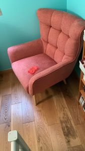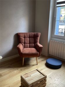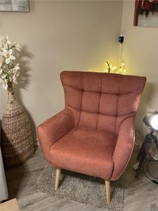 Fauteuil scandinave en tissu effet velours texturé terracotta et bois clair AVERY