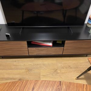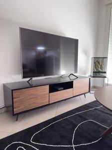Meuble TV bois foncé noyer, noir mat et métal noir 2 portes 1 tiroir L160 cm MERMOZ
