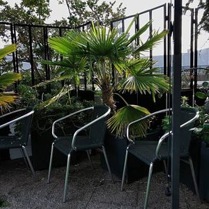 grand paravent en verre et métal noir se déploie pour former une élégante