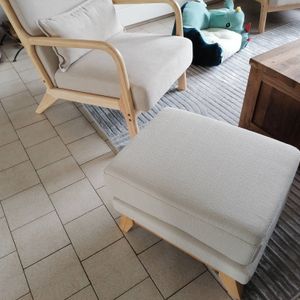 Pouf repose-pieds déhoussable scandinave en tissu beige et bois clair OSLO livré à assembler. Montage simple, seuls les pieds sont à fixer.