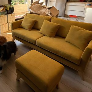 Pouf repose-pieds déhoussable scandinave en tissu effet velours jaune moutarde et bois clair OSLO livré à assembler. Montage simple, seuls les pieds sont à fixer.